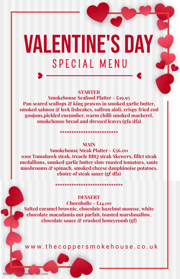 Our specials menu for valentines, bookings between 6pn and 8.30pm call us on 01502589843 or click on the book a table below