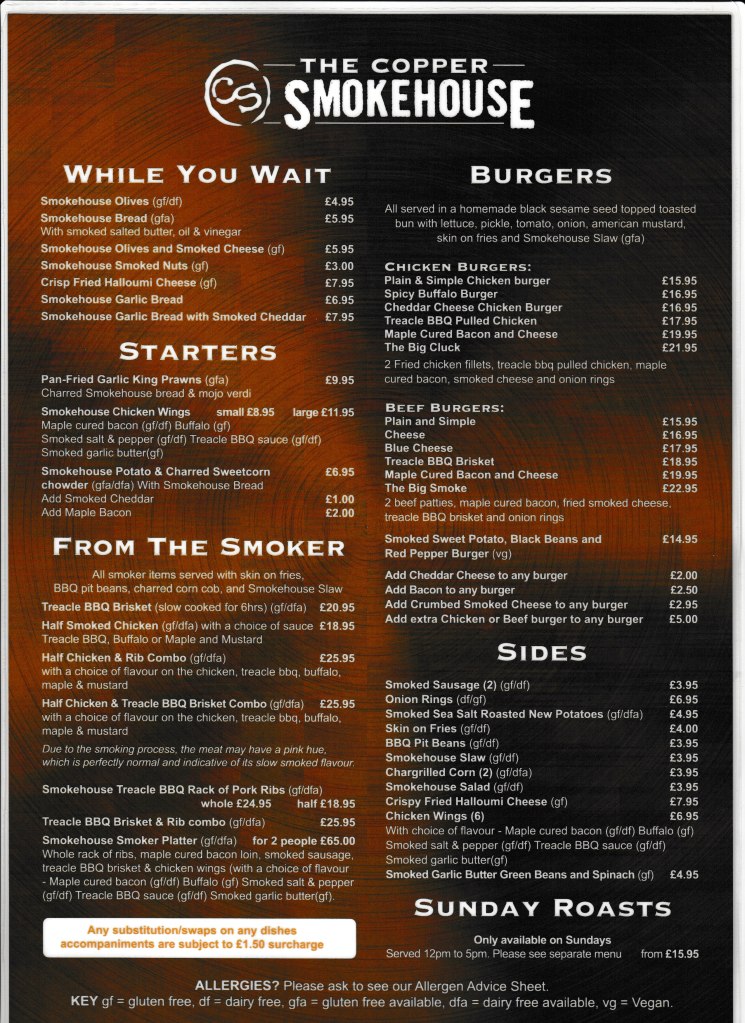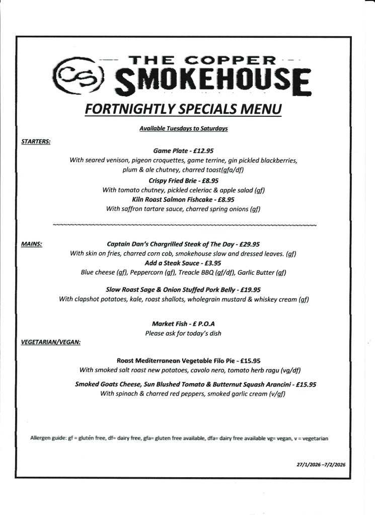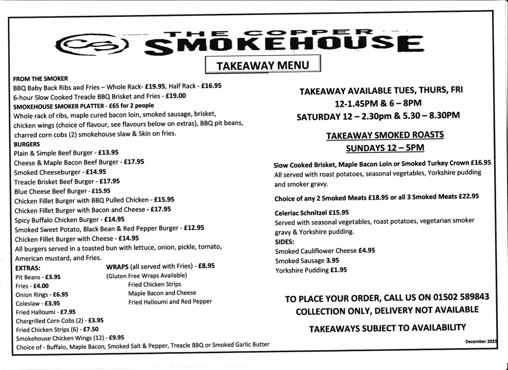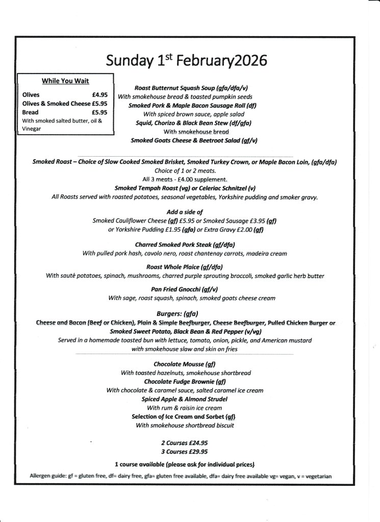 Sunday 12 – 5.pm (last booking 4.30pm) where our Smoked roasts will be available.